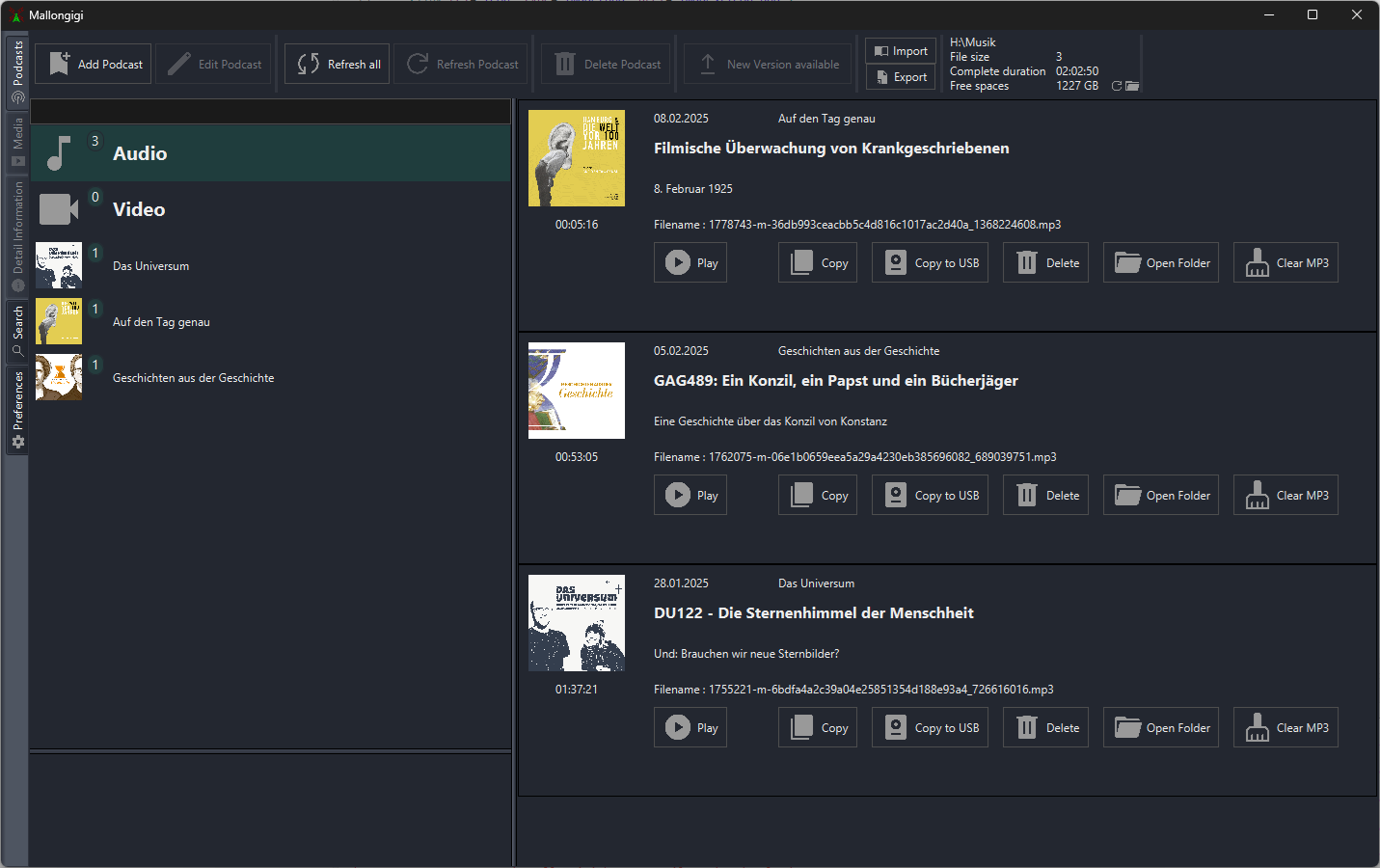 Mallongigi prüft alle Podcast-Feeds beim Start auf neue Episoden. Nach